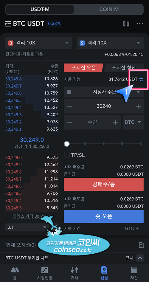 1. 선물거래 화면의 사용 가능 자산이 표시된 우측의 양쪽 화살표를 클릭합니다.