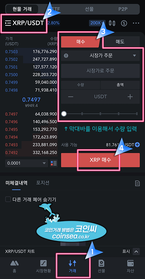 MEXC거래소 앱 하단의 "거래"를 클릭하시면 현물거래 화면으로 이동되는데 거기에서 코인 심볼을 클릭해서 XRP/USDT를 선택합니다. 그리고 USDT를 이용해서 리플을 매수해야 하므로 '매수' 탭을 선택합니다.