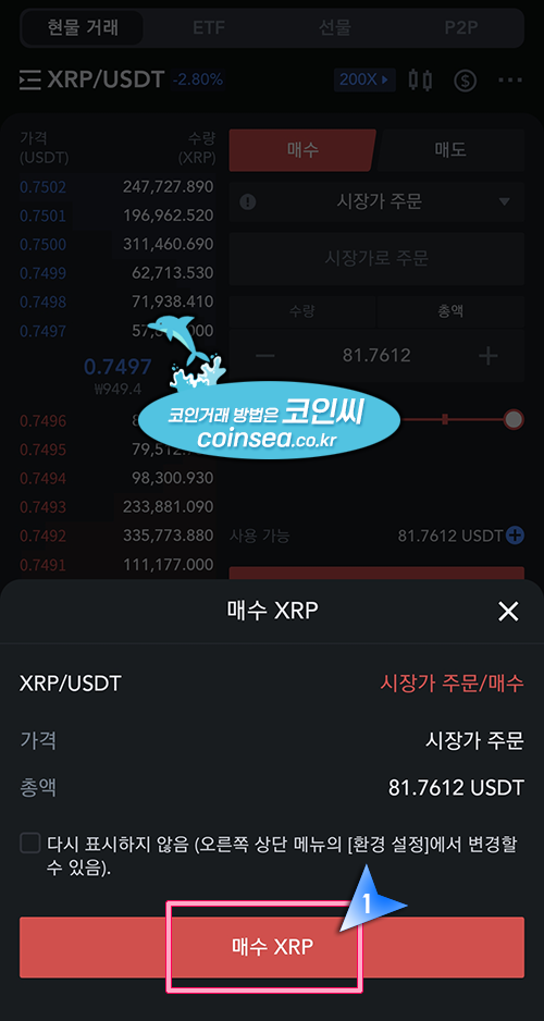 5. 주문을 넣으면 안내창이 나오는데 이 안내창을 다음부터는 보지 않고 곧바로 주문을 발동시키려면 "다시 표지하지 않음"에 체크하시면 됩니다. "매수 XRP"를 클릭합니다.