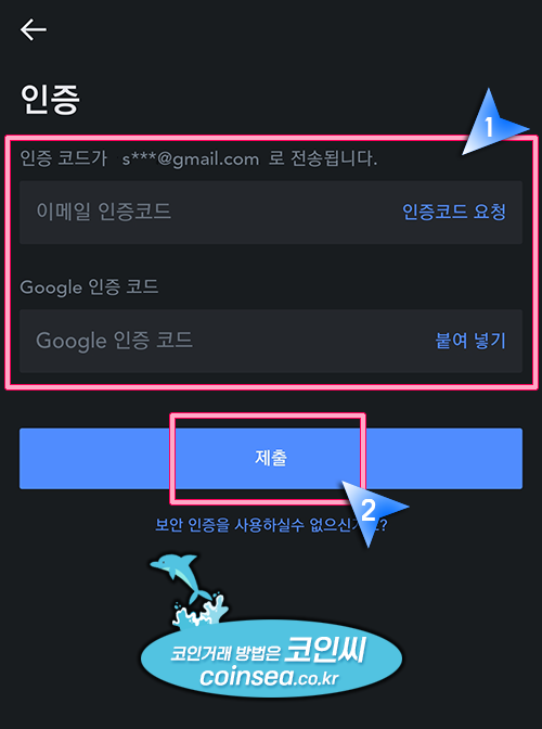 12. MEXC 보안설정에서 Google OTP인증을 진행하지 않으신 분들은 미리 해주셔야 출금이 가능합니다. OTP설정을 하신 분들은 이메일 "인증코드 요청"을 클릭해서 인증코드를 받은 후 입력해주시고, Google OTP 인증코드도 입력후 "제출"을 클릭합니다.