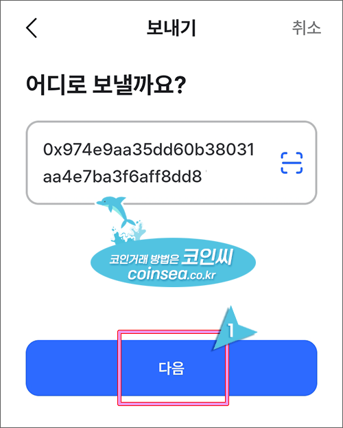 6. 클레이의 입금주소를 복사했다면 조금 전 카카오 클립의 클레이 출금화면으로 이동해서 복사한 입금주소를 붙여넣기 후 "다음" 버튼을 클릭합니다.
