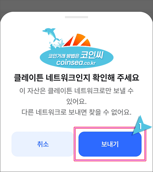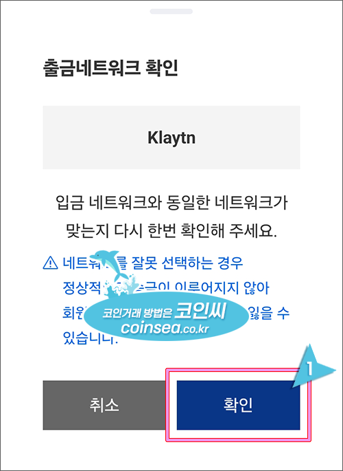 15. 출금네트워크가 Klaytn(클레이튼)인지 다시한번 확인하라는 메시지입니다. "확인"을 클릭합니다. 코인은 입출금시 반드시 동일한 네트워크를 이용해야 정상적으로 입금되고 서로 다른 네트워크를 이용해서 전송하면 코인이 유실되어 찾지 못하니 항상 주의하시기 바랍니다.