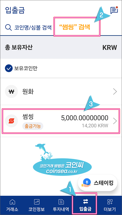코인원을 이용하시는 분들은 코인원 - 자산 - 입출금 - 검색창에 '썸씽' 검색후 선택하여 출금을 선택하시면 됩니다.
