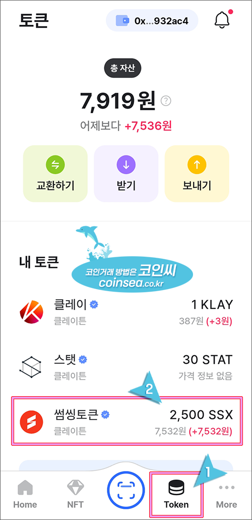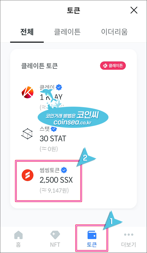 1. 카카오 클립 하단의 토큰 메뉴 클릭후 입금된 썸씽토큰을 선택합니다.