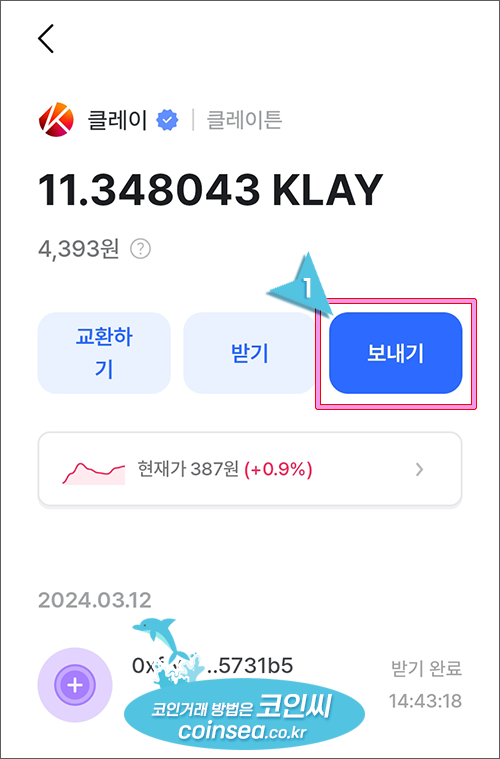 13. 이렇게 가지고 있던 썸씽코인이 클레이로 스왑되었습니다. 다음은 스왑된 클레이를 거래가 가능한 거래소로 보내서 현금화하는 방법에 대해서 알아보도록 하겠습니다.