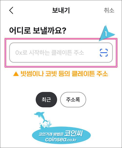 3. 주소 입력창에 빗썸이나 코빗, 코인원 등의 클레이튼 입금 주소를 복사하여 붙여넣기 합니다.