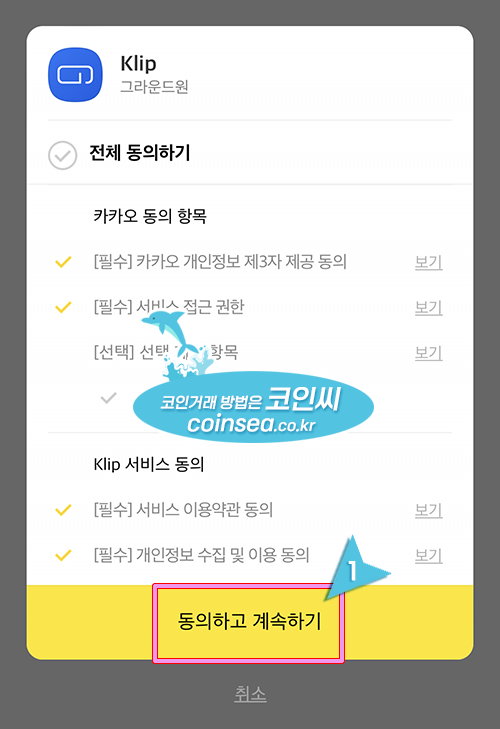 4. 전체 동의하기를 클릭하거나 광고수신을 제외한 선택 동의후 "동의하고 계속하기"를 클릭합니다.