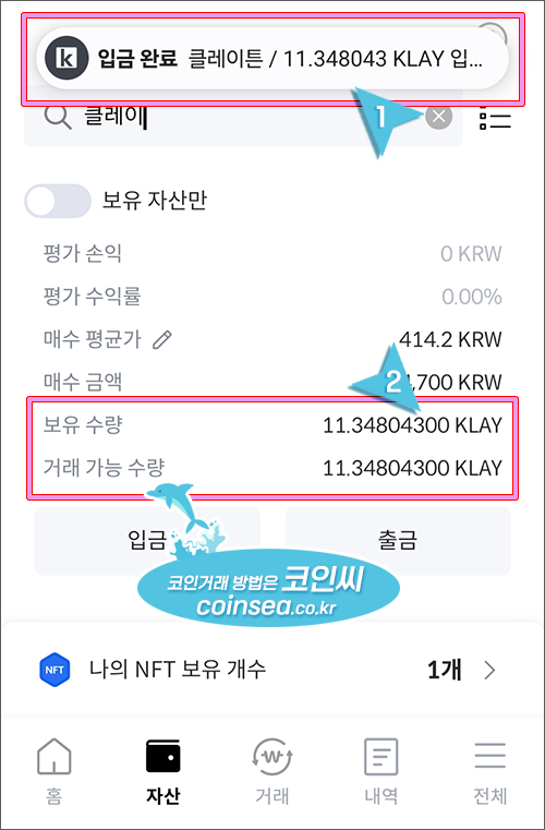 11. 여러분이 클레이 입금주소를 복사한 거래소로 이동해서 클립에서 보낸 클레이가 입금되었는지 확인합니다. 전송속도가 빨라서 대부분 10분안에 입금됩니다.