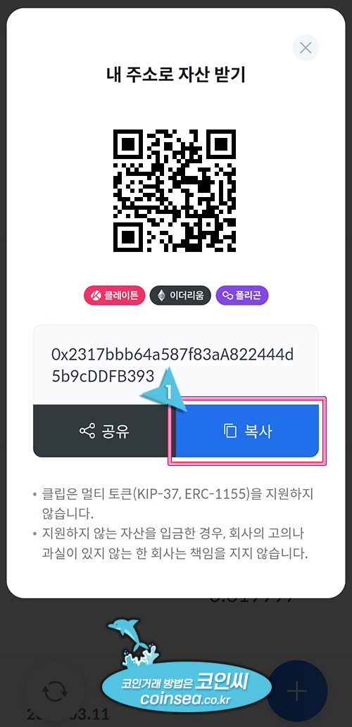 4. "복사" 버튼을 클릭해서 클레이 입금주소를 복사한 후, 그 주소로 빗썸이나 코인원, 코빗 등에서 클레이를 클립 지갑으로 입금합니다.