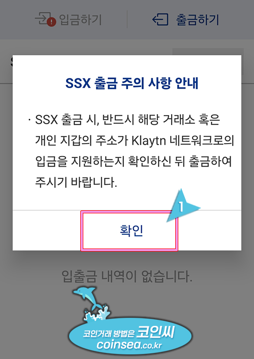 13. 클레이튼 네트워크 입금을 지원하는지 확인후 출금하라는 내용입니다. "확인"을 클릭합니다.