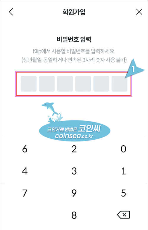5. 카카오클립에서 사용한 6자리 비밀번호를 입력합니다. 연속된 3자리 숫자나 본인의 생년월일 등은 사용할 수 없습니다.