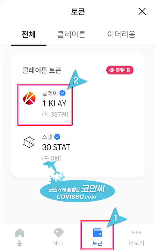 1. 스왑 수수료인 클레이를 입금하기 위해서 카카오 클립 지갑 하단에서 토큰 메뉴를 선택후, 클레이를 클릭합니다.