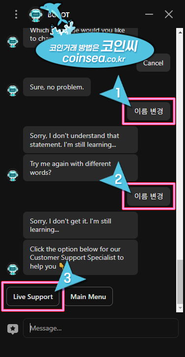 5. 상담봇이 무슨 말인지 몰라서 상담원을 호출할 수 있도록 "이름 변경"을 2번 입력합니다. 그러면 Live Support 버튼이 생성되는데 그것을 클릭합니다.