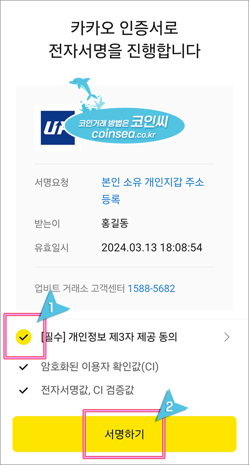 10. 정보 제공 동의에 체크 후, "서명하기"를 클릭하여 서명을 해주세요.