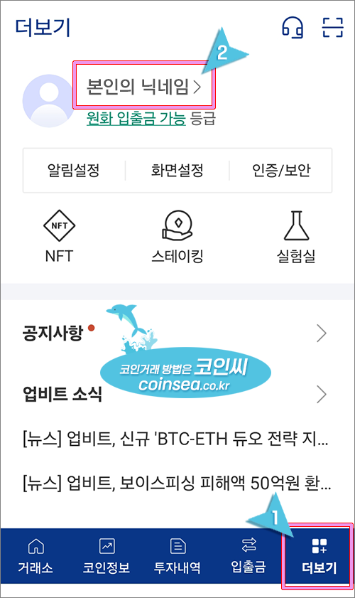 1. 업비트 앱 하단의 "더 보기"를 클릭후 본인의 닉네임을 클릭합니다.