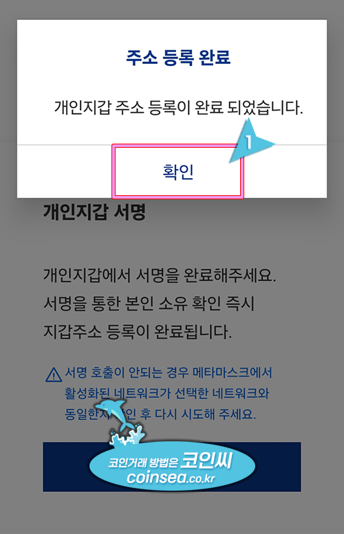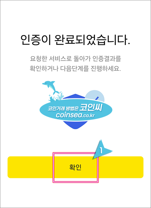 11. 인증이 완료되었습니다. 확인을 클릭후 업비트 개인지갑 등록화면으로 이동합니다.