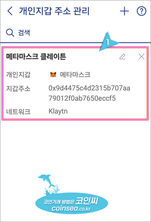 16. 개인지갑 주소 관리에 방금 등록한 메타마스크 클레이튼 네트워크의 지갑 주소가 보여집니다. 나중에 메타마스크 클레이튼 지갑으로 코인을 출금시 지갑 주소에서 이 주소를 선택하시면 됩니다.