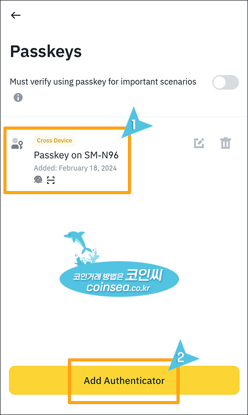 10. 이렇게 패스키가 등록되었습니다. 패스키는 코인 출금시 별도의 인증없이 화이트 주소록에 있는 주소로 빠르게 출금이 가능합니다. OTP 등록이 필요하신 분들은 하단의 Add Authenticator 버튼을 클릭합니다.