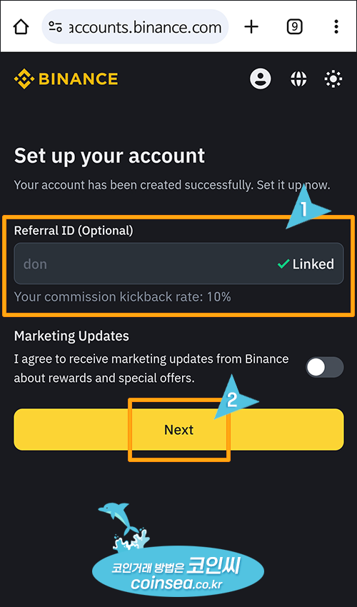 7. Referral ID에 don이 입력되어 있다면 정상적으로 수수료 할인이 적용된 것입니다. 만약 입력되지 않았다면 don을 입력해주시고 "Next" 버튼을 클릭합니다.