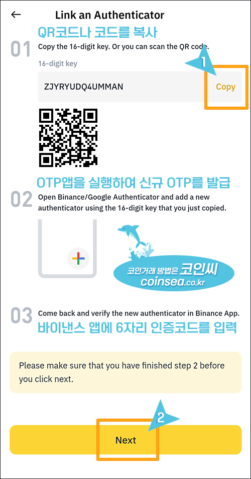 13. 휴대폰에서 OTP 앱을 설정하는 경우는 QR코드 스캔이 안되므로 16-digit key를 먼저 복사(Copy)해서 OTP앱에 사이트를 추가해 줍니다. 그리고 하단의 "Next" 버튼을 클릭하여 신규 발행된 6자리 OTP 인증번호를 입력해주시면 됩니다.