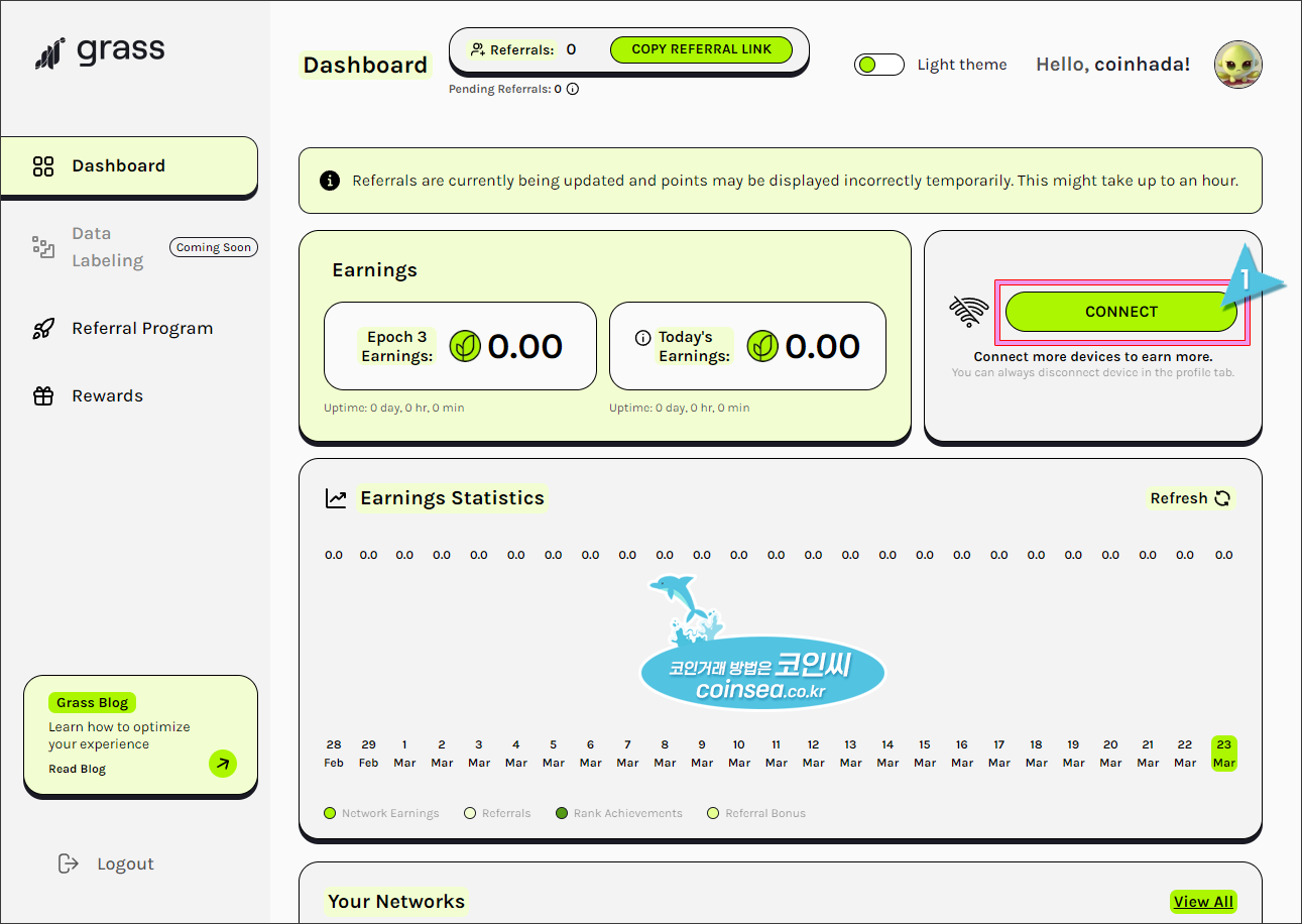 13. 만약 Grass를 지인이나 친구에게 소개하고 싶다면 상단의 Copy Referral Link를 클릭후, 하단에 나오는 자신의 추천링크를 복사하여 전해주시면 됩니다.