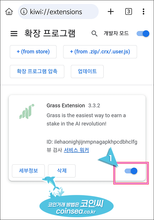 8. 확장 프로그램 관리에서 Grass Extension 하단의 버튼을 클릭하여 활성화시켜줍니다.