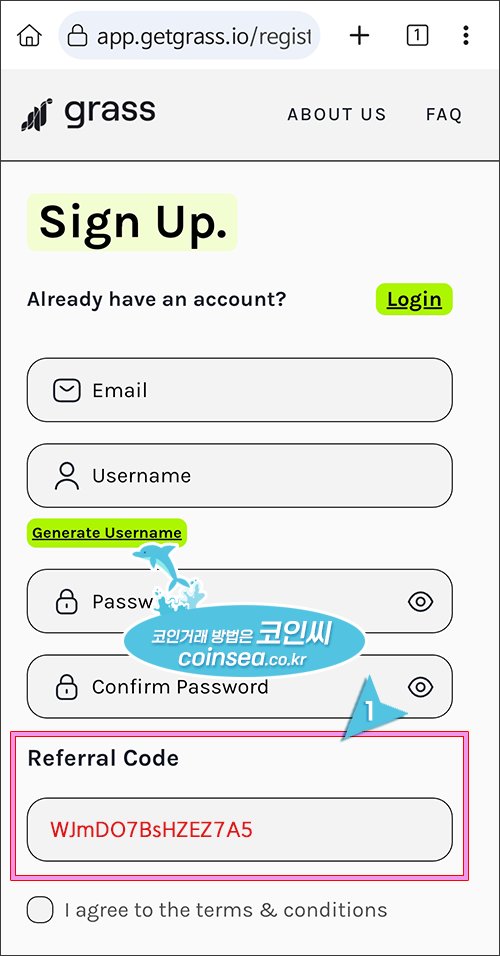 5. 이메일 주소와 닉네임, 패스워드를 입력하시고 Referral Code가 누락되어 있다면 WJmDO7BsHZEZ7A5 를 복사하여 붙여넣기 합니다. Referral Code가 없다면 추천수당으로 지급받는 5,000점을 받지 못하니 반드시 입력하시기 바랍니다.