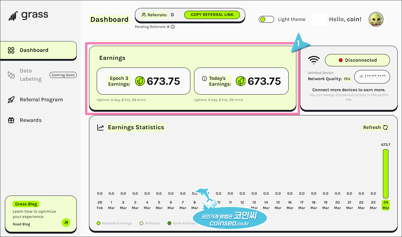 16. 이제 모든 준비가 완료되었고 Grass가 연결되면 Connect가 Disconnected라고 나오고 조금 있다 Connected라고 뜨면서 에어드랍(채굴)이 시작됩니다.