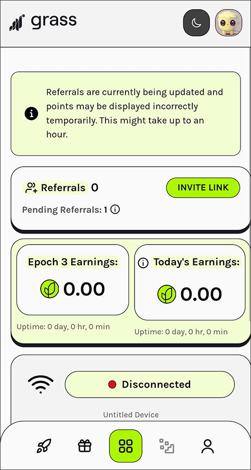 11. Grass가 연결되면 Connect가 Disconnected라고 나오고 조금 있다 Connected라고 뜨면서 에어드랍(채굴)이 시작됩니다.