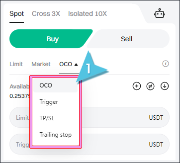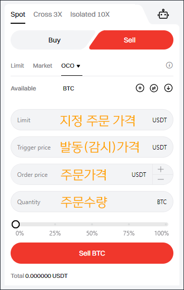 현물 거래 화면으로 이동하여 OCO를 클릭한 다음, OCO 매도 주문을 생성하세요.