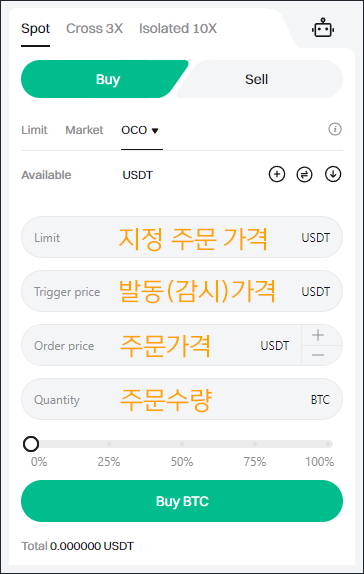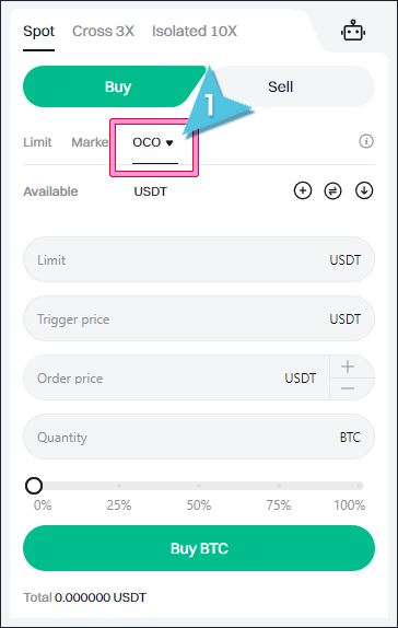 현물 거래 화면으로 이동하여 OCO를 클릭한 다음, OCO 매수 주문을 생성하세요.