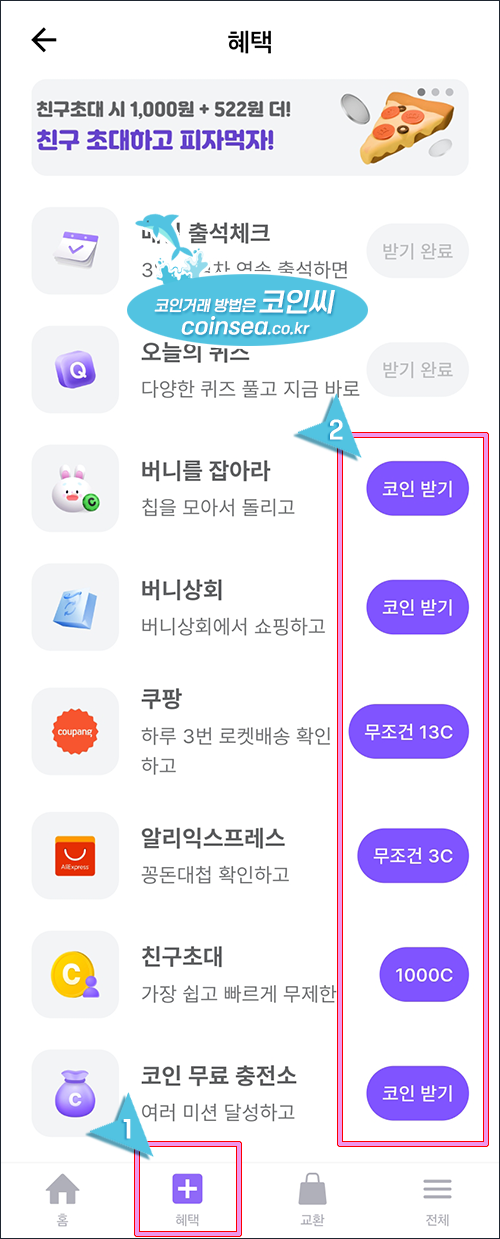 또한 맨 하단의 "혜택" 메뉴를 클릭하면 코인을 받을 수 있는 적립 가능한 미션이 상당히 많이 있으니 각각 클릭해서 코인을 적립받으시면 됩니다.