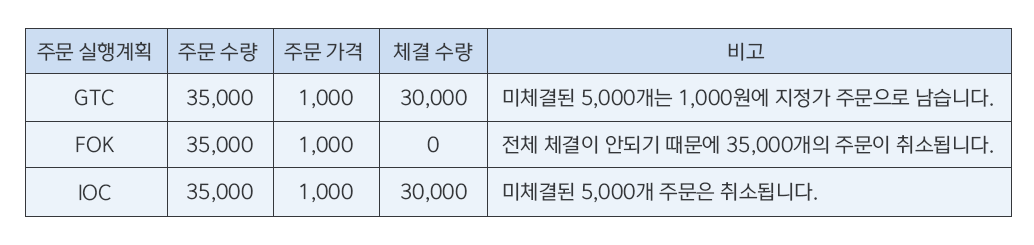 3. 거래자가 IOC를 선택할 경우, 1,000원에 30,000개가 체결되고, 미체결된 5,000개 주문은 취소됩니다.