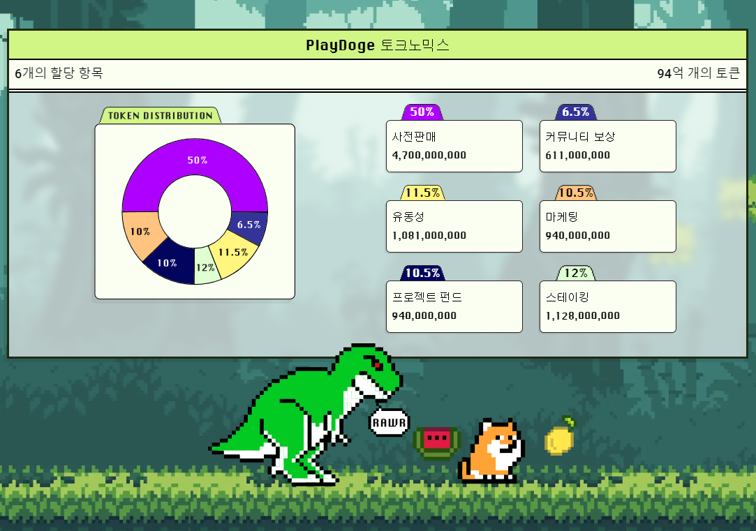 플레이도지는 현재 94억개의 토큰을 보유하고 있습니다. 그중 절반인 47억개가 사전 판매에 할당됩니다. 나머지 토큰은 아래와 같이 분배됩니다.