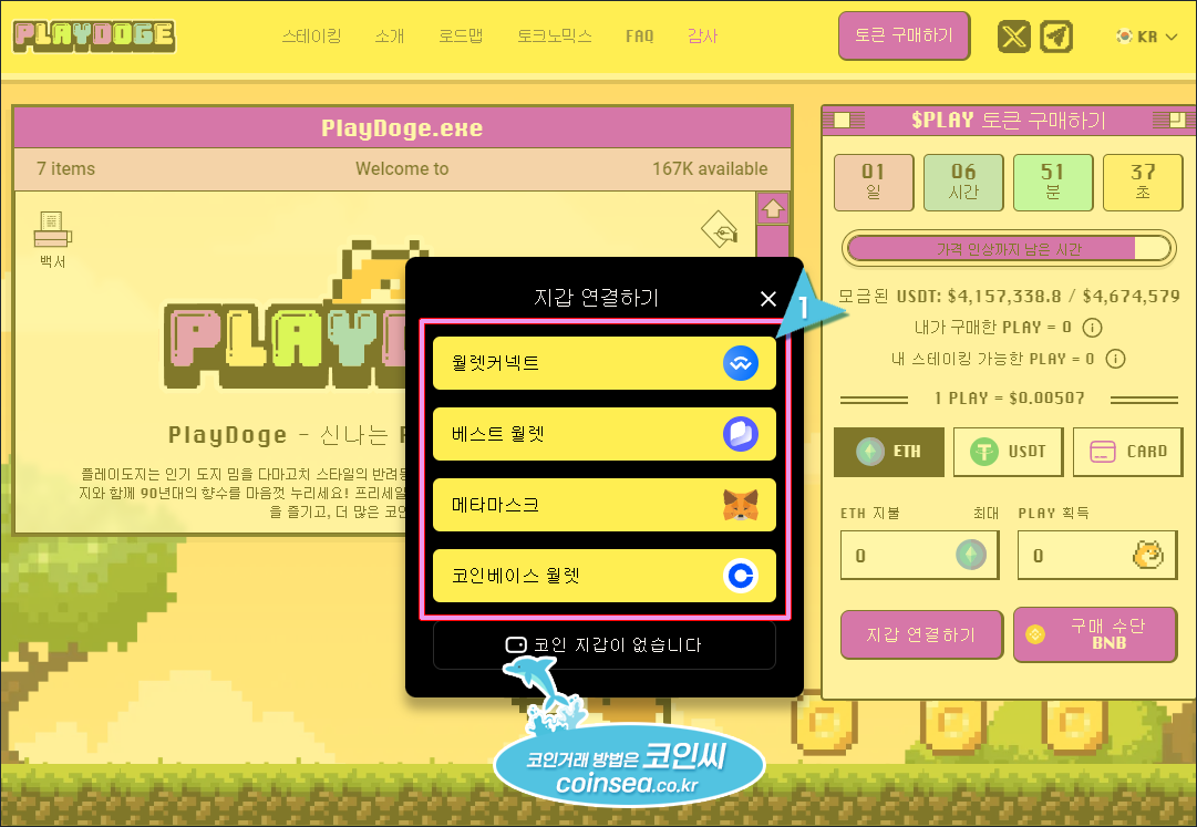 플레이도지 홈페이지에 연결 가능한 지갑은 메타마스크, 코인베이스 월렛, 베스트월렛 등입니다. 그리고 BNB나 ETH, USDT를 이용해서 플레이도지 토큰의 구매가 가능합니다. 따라서 국내거래소에서 해당 코인을 구매후 자신이 이용하는 월렛에 먼저 입금해 놓습니다.