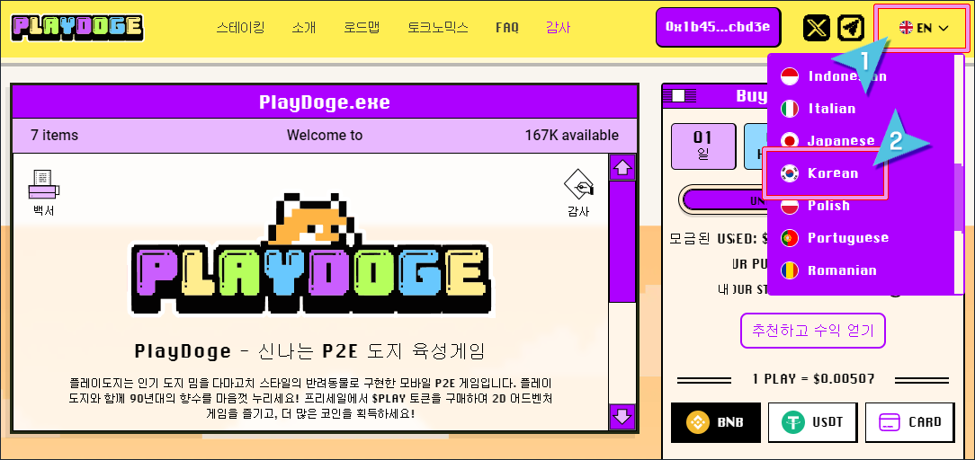 먼저 프로젝트 공식 웹사이트(playdoge.io)를 방문하세요. 화면이 영문으로 나오시는 분들은 우측 상단의 EN을 클릭후, Korean으로 변경해주시면 한글로 볼 수 있습니다.