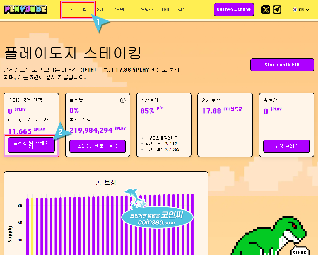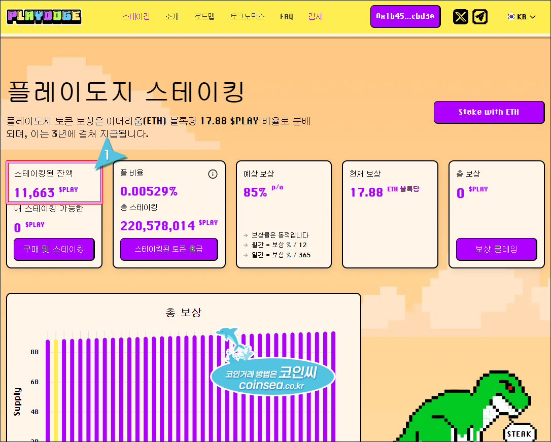 스테이킹 신청이 완료되면 스테이킹된 잔액에 표시됩니다. 스테이킹 총 보상 일정은 하단의 그래프에 보여지며 3년에 걸쳐서 지급됩니다.