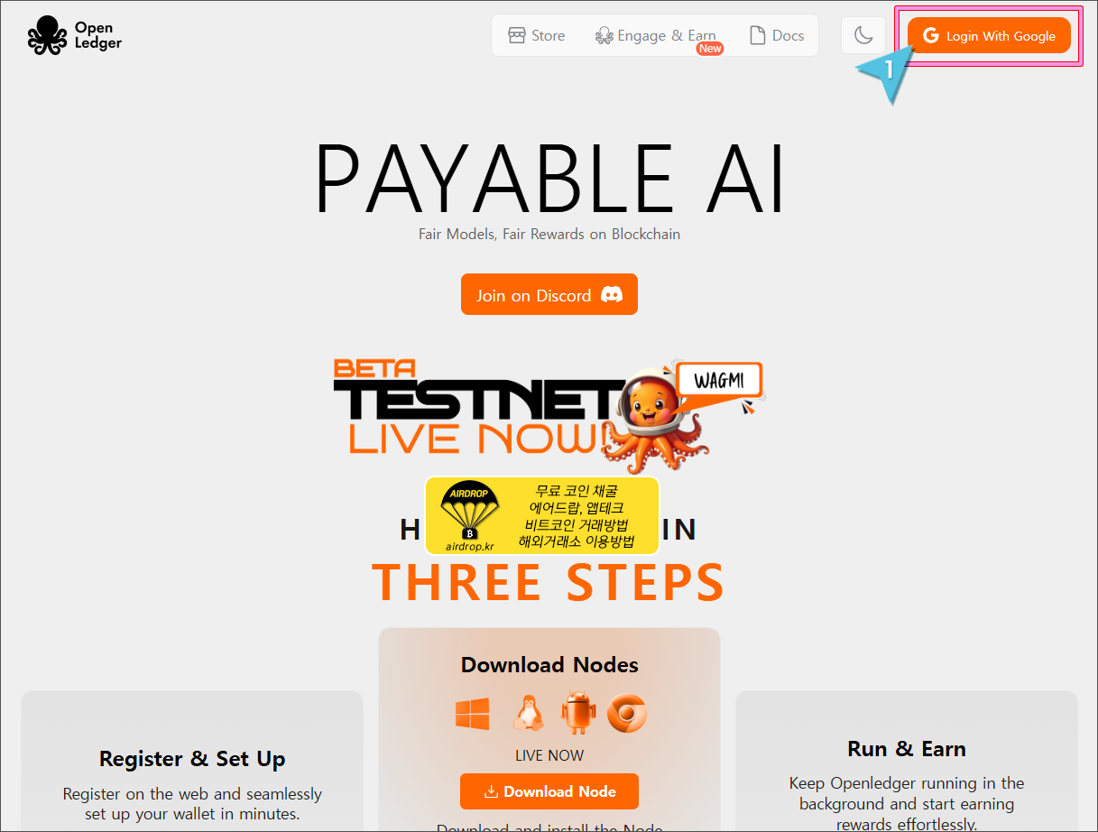 5. 오픈렛저 메인 화면에 접속되면 상단의 "Login With Google"를 클릭합니다. 참고로 가입은 구글 계정으로만 가능합니다.