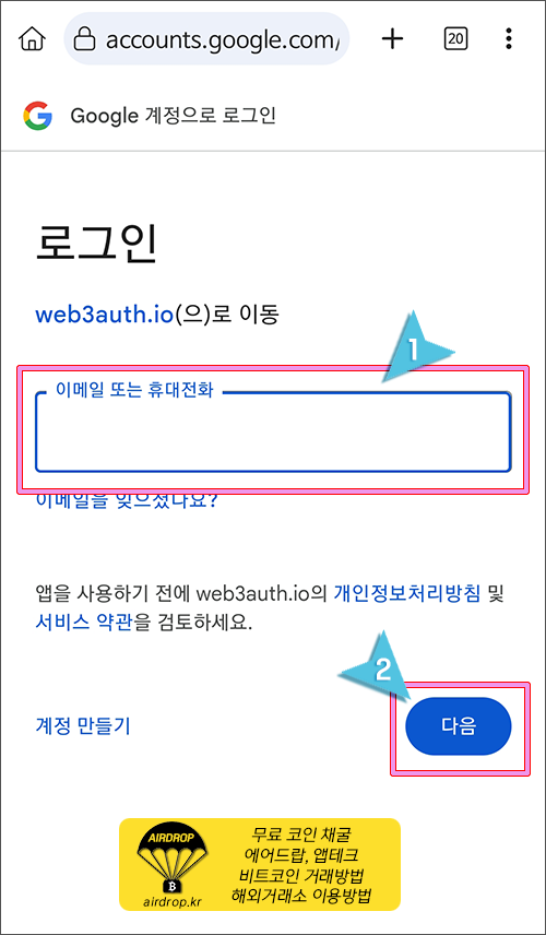 6. 자신의 구글 이메일주소를 입력후 "다음"을 클릭합니다.
