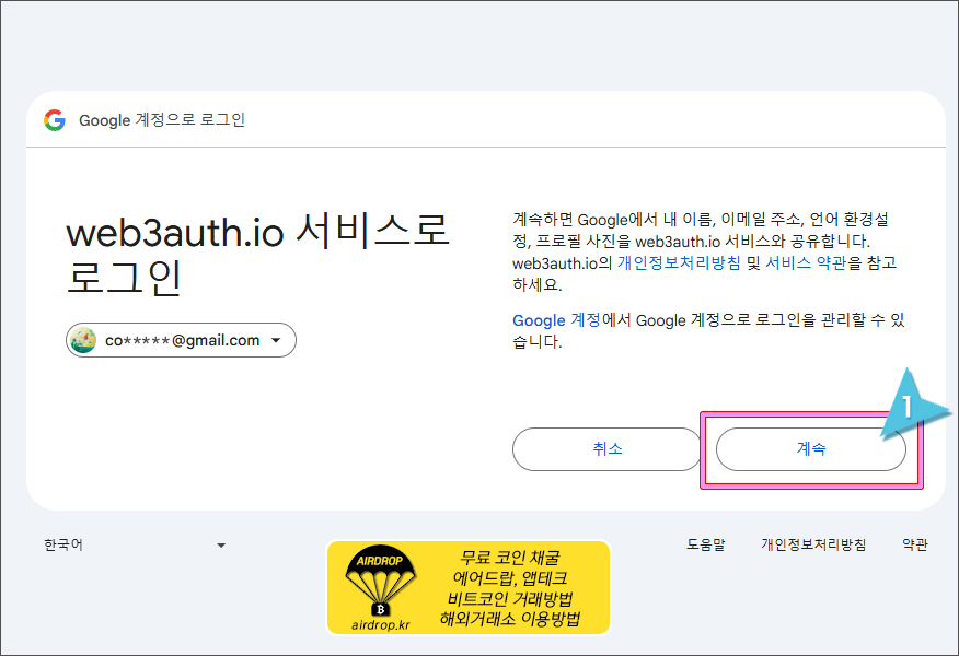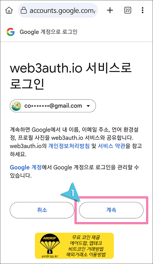 15. "계속"을 클릭해서 방금전에 오픈렛저에 가입했던 동일한 구글 계정으로 로그인을 합니다.