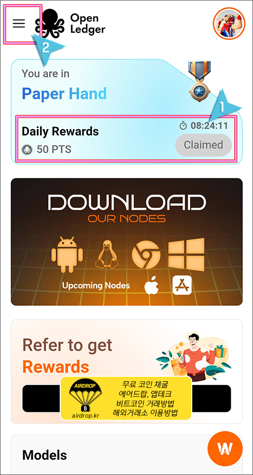 21. 오픈렛저 화면에서 좌측 상단의 메뉴 버튼을 눌러서 미션이나 리워드가 있는지 확인해서 추가 리워드도 받으시기 바랍니다.