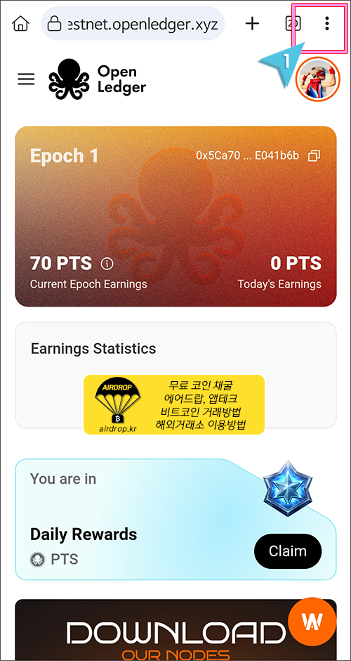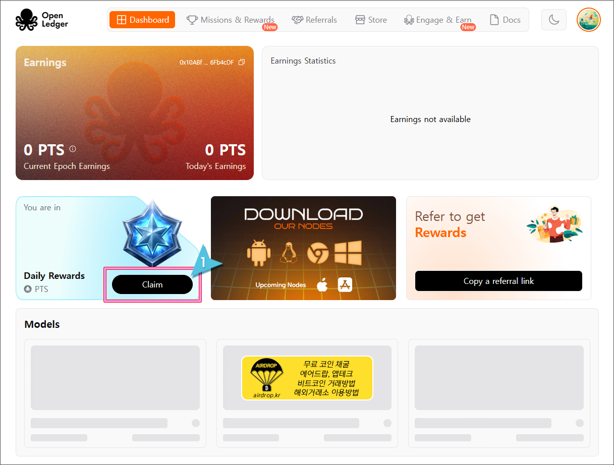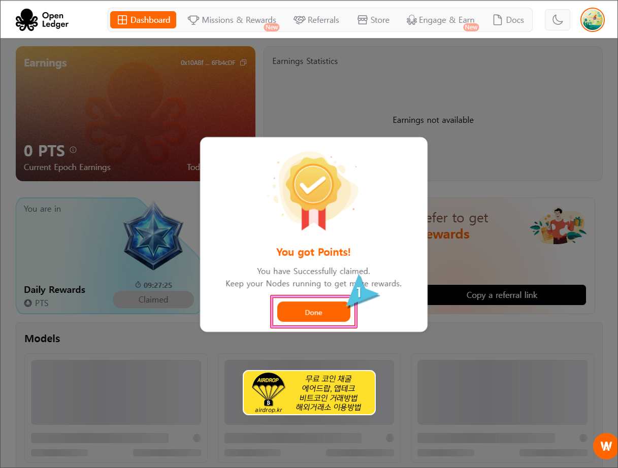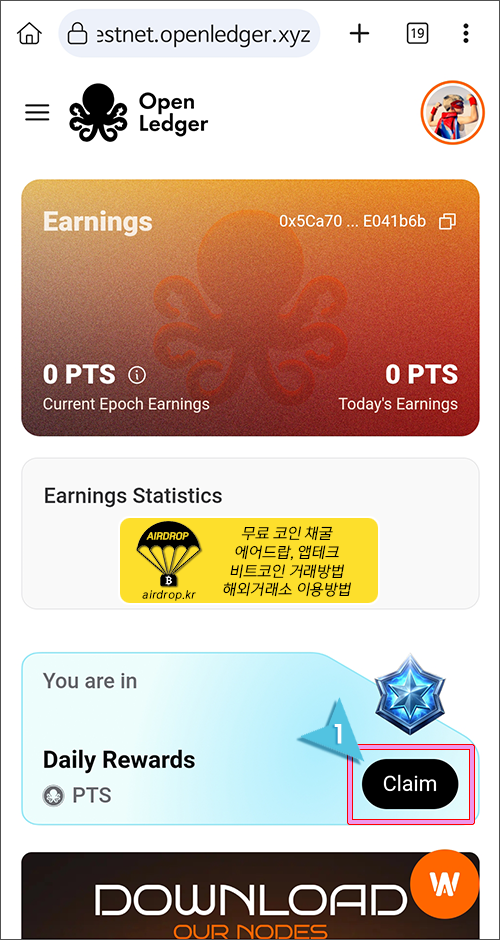 8. 아주 간단히 오픈렛저에 가입이 완료되었습니다. Daily Rewards에 있는 Claim 버튼을 눌러서 오늘의 포인트를 적립합니다.