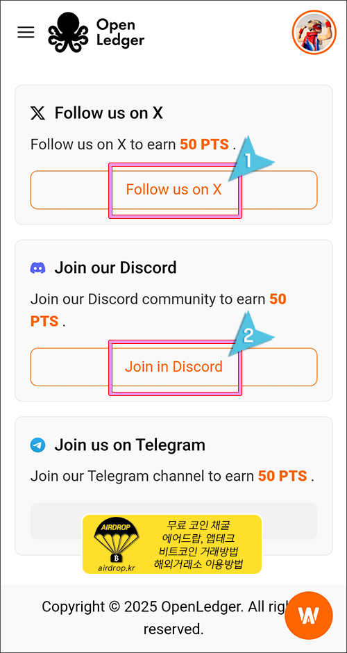 23. X를 팔로우 해서 포인트를 얻거나, 디스코드에 가입하면 추가 포인트를 얻을 수 있습니다.