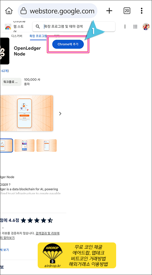 10. 오픈렛저 노드 확장프로그램 화면 우측의 "Chrome에 추가"를 클릭합니다.