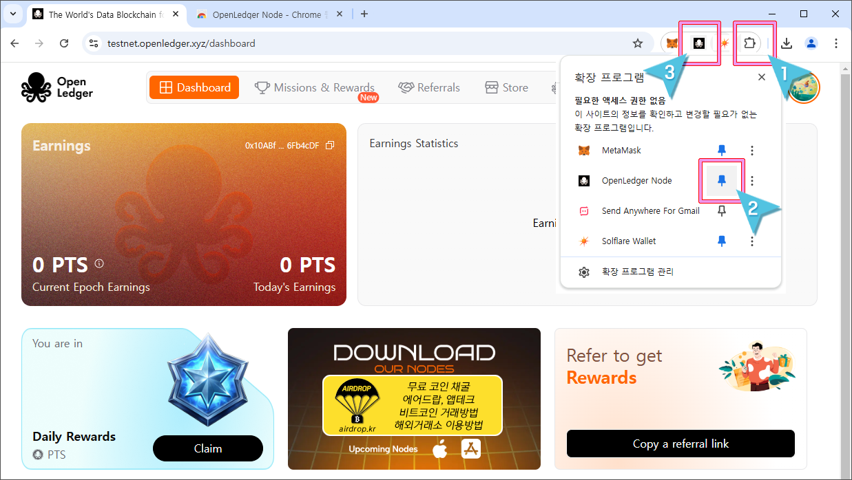 17. 매일 하루에 한번씩 크롬 브라우저 상단의 확장프로그램에서 오픈렛저 아이콘을 클릭해서 노드에 로그인하고 Daily Rewards를 클릭해주시면 되는 아주 간단한 무료 채굴입니다.