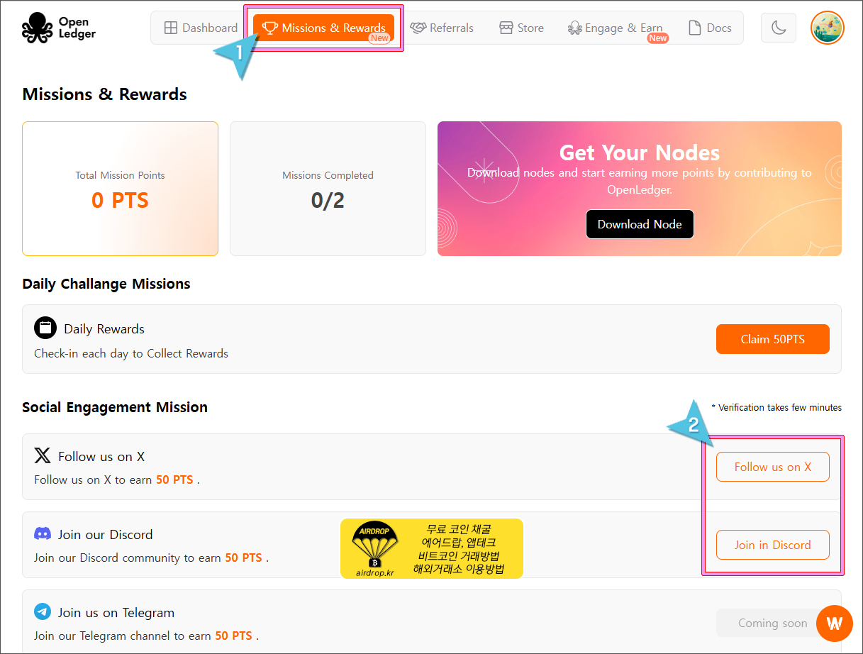 8. 상단 메뉴중에 Missions & Rewards를 클릭하시면 추가 포인트를 얻을 수 있는 미션이 있습니다. 오픈렛저 X를 팔로우 하거나 디스코드에 가입시 해당 포인트가 적용되니 진행해 보시기 바랍니다.
