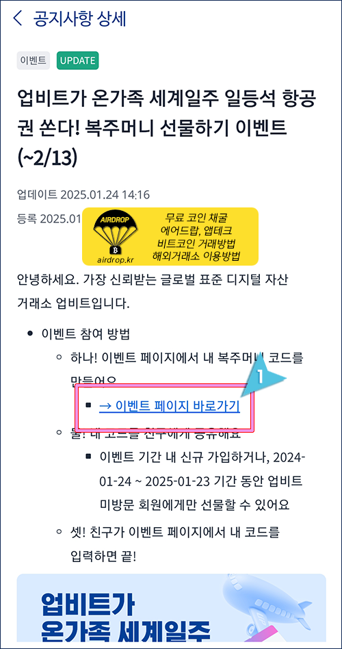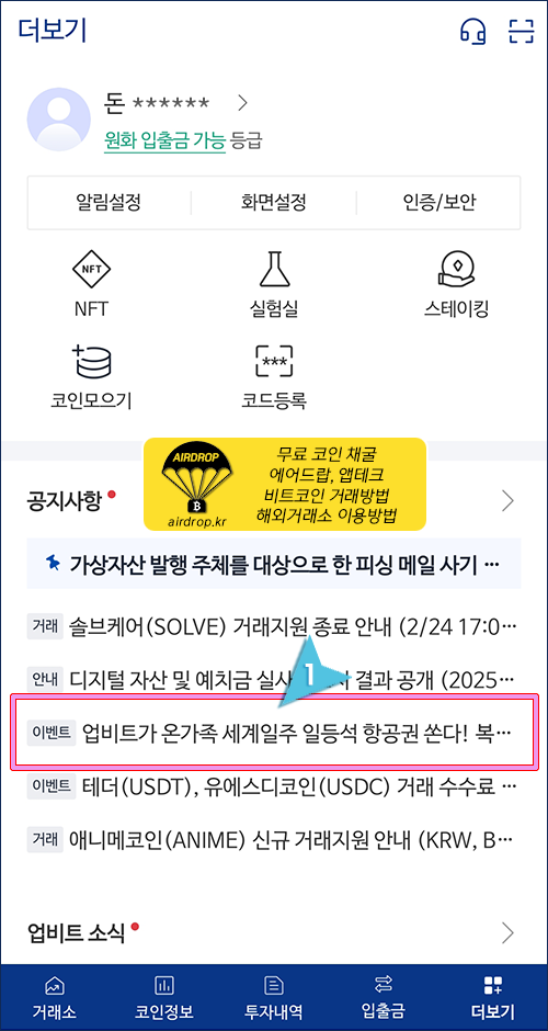 3. 공지사항에서 "업비트가 온가족 세계일주 일등석 항공권 쏜다!" 이벤트를 클릭합니다.