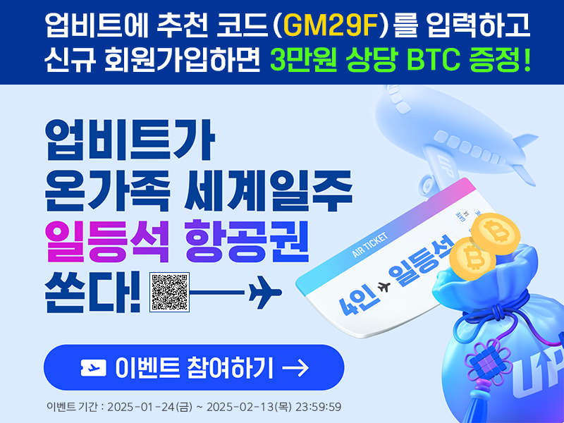 업비트(Upbit) - 세계일주 4인 일등석 왕복 항공권 자동 응모 및 신규가입 3만원 상당 BTC 증정금 받는 방법