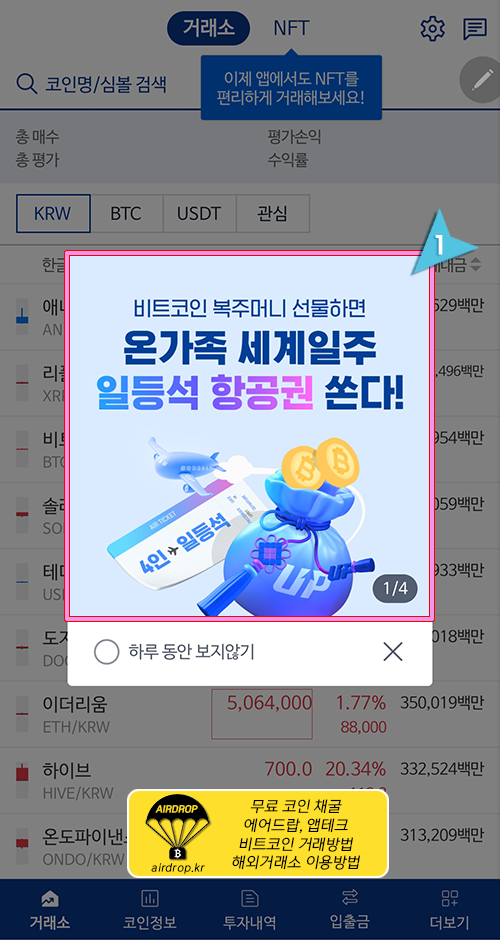 1. 업비트 거래소에 가입 후, 앱에 접속하면 나오는 "온가족 세계 일주" 배너를 클릭합니다.