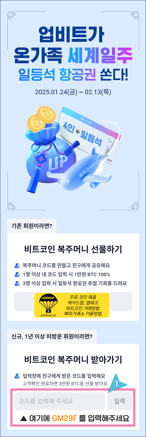 5. '비트코인 복주머니 받아가기'에서 '코드를 입력해 주세요' 부분에 추천인 코드(GM29F)를 복사하여 붙여넣기 하시고 "입력"을 눌러주시면 됩니다.